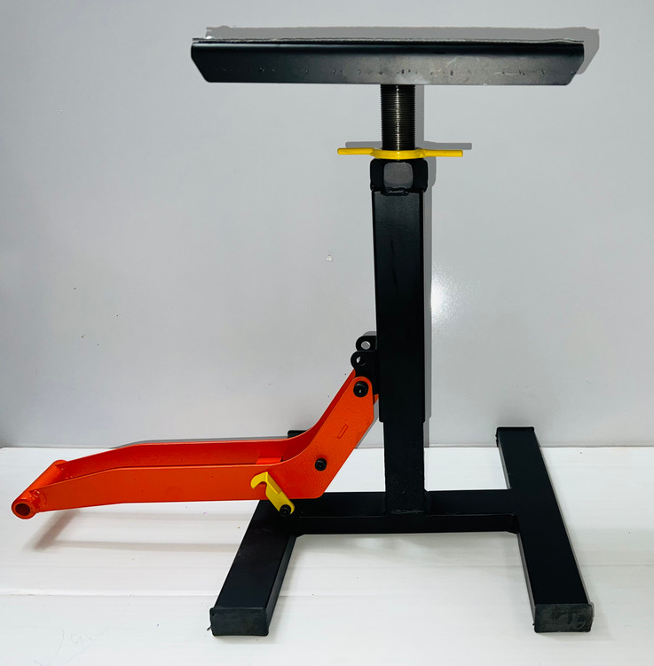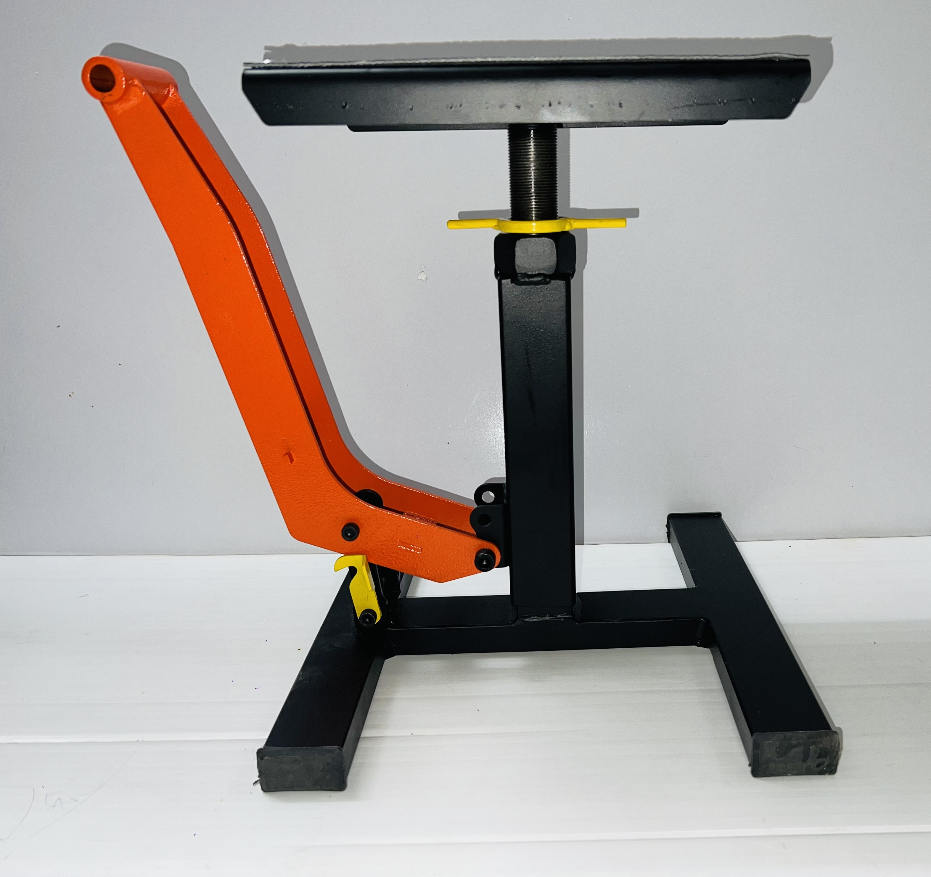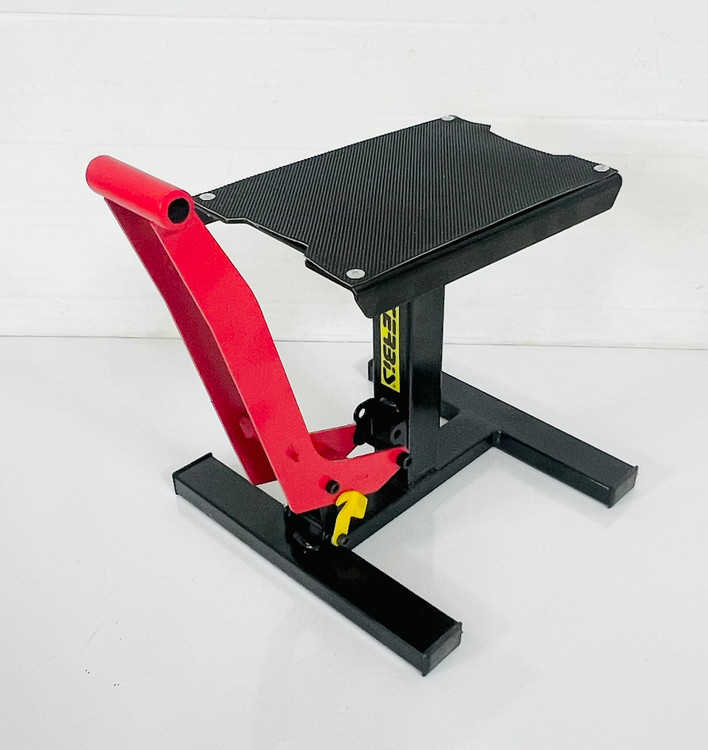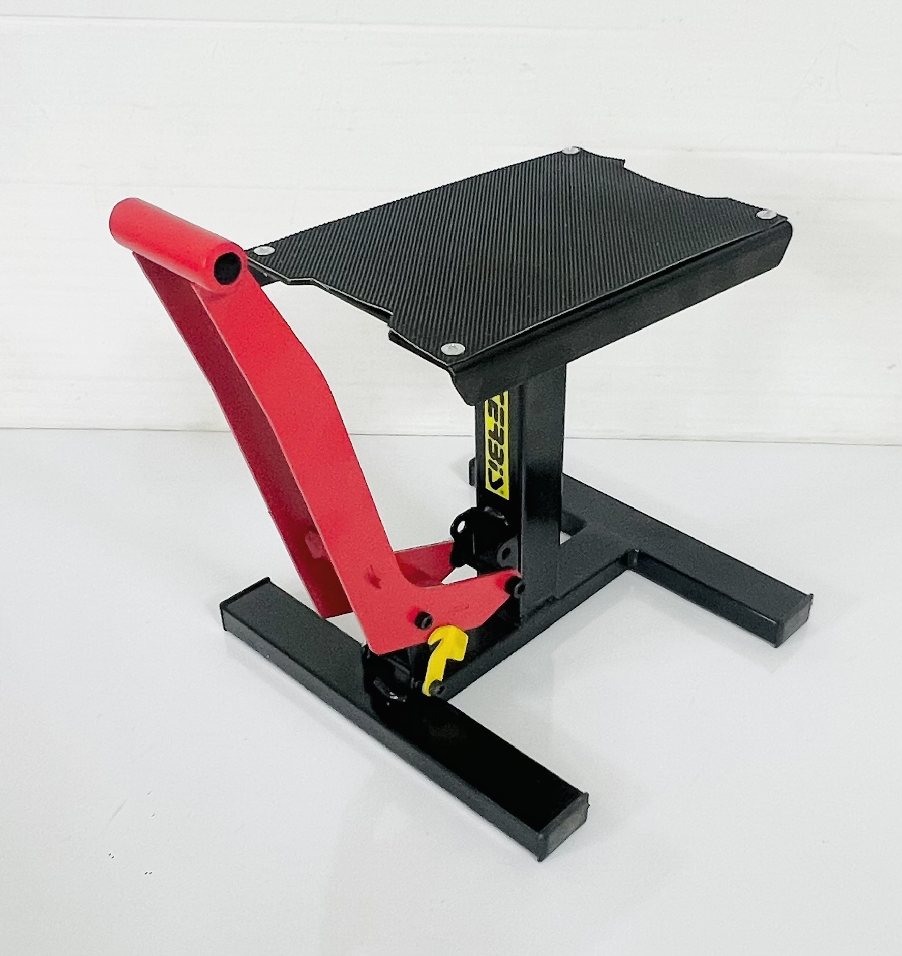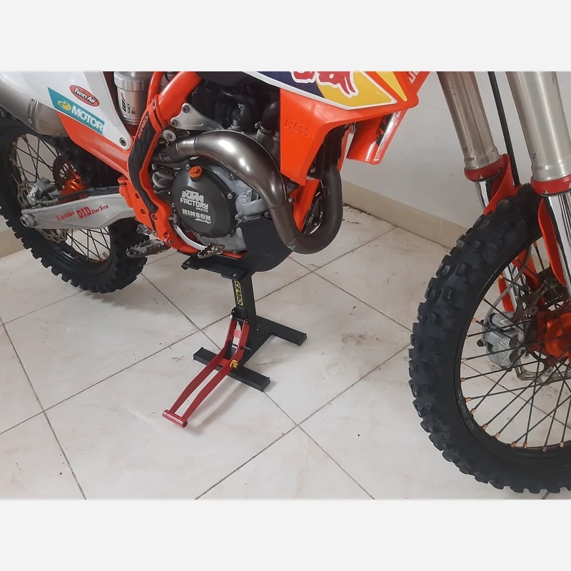 جک پدالی مخصوص انواع موتورهای کراس و تریل که فاقد جک وسط هستند طراحی و تولید شده است. در زیر شاسی موتور قرار گرفته و با اعمال کمترین نیرو با مکانیزم اهرم بصورت پدال پایی، موتور تا وزن 150 کیلوگرم را به راحتی از روی زمین بلند میکند. در این حالت هر دو چرخ موتور از زمین جدا شده و موتور بصورت معلق بر روی جک قرار میگیرد که میتوان موتور را به مدت طولانی پارک کرد. عدم فشار به لاستیکها، عدم فشار به سیستم کمک فنر موتور، عدم فشار به کاسه نمدهای انجین و جلوگیری از نشت روغن از مزایای پارک موتور با این جک میباشد. همچنین بعنوان استند برای تعویض لاستیک، تعویض روغن و تعمیرات نیز استفاده میشود. با توجه به وجود پیچ ریگلاژ، میتوان ارتفاع جک را از27 سانتیمتر تا 35 سانتیمتر تنظیم نمود که برای انواع موتورهای کراس و تریل با ارتفاعهای مختلف قابل استفاده خواهد بود. دارای قفل پیچ ریگلاژ میباشد که بعد از تنظیم ارتفاع جک به اندازه دلخواه بکمک آن میتوان پیچ ریگلاژ را قفل کرد. همچنین در حالتی که موتور روی جک قرار دارد میتوان بطور کامل موتور را چرخاند. دارای ضامن قفل پدال برای جلوگیری از آزاد شدن پدال نیز میباشد.
