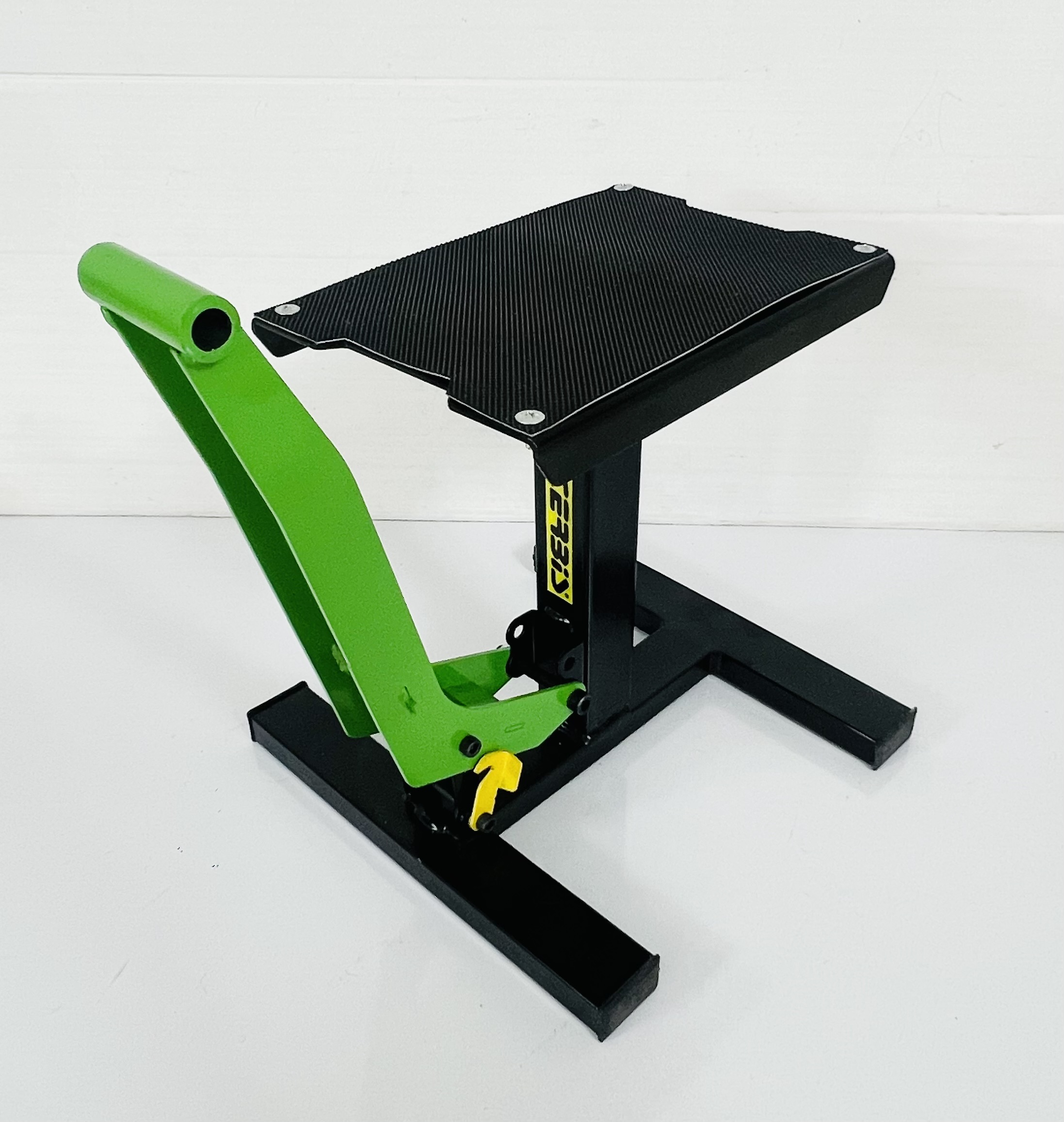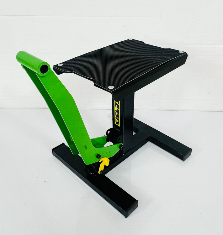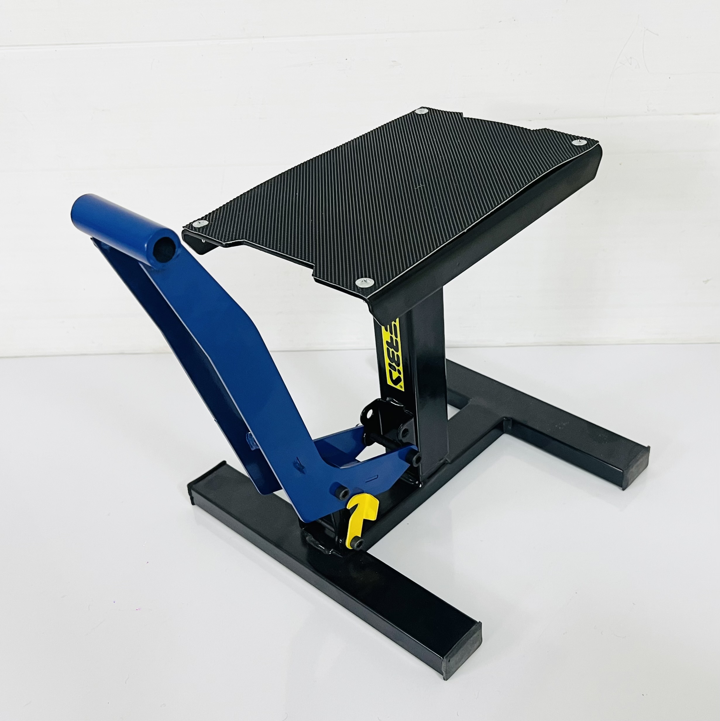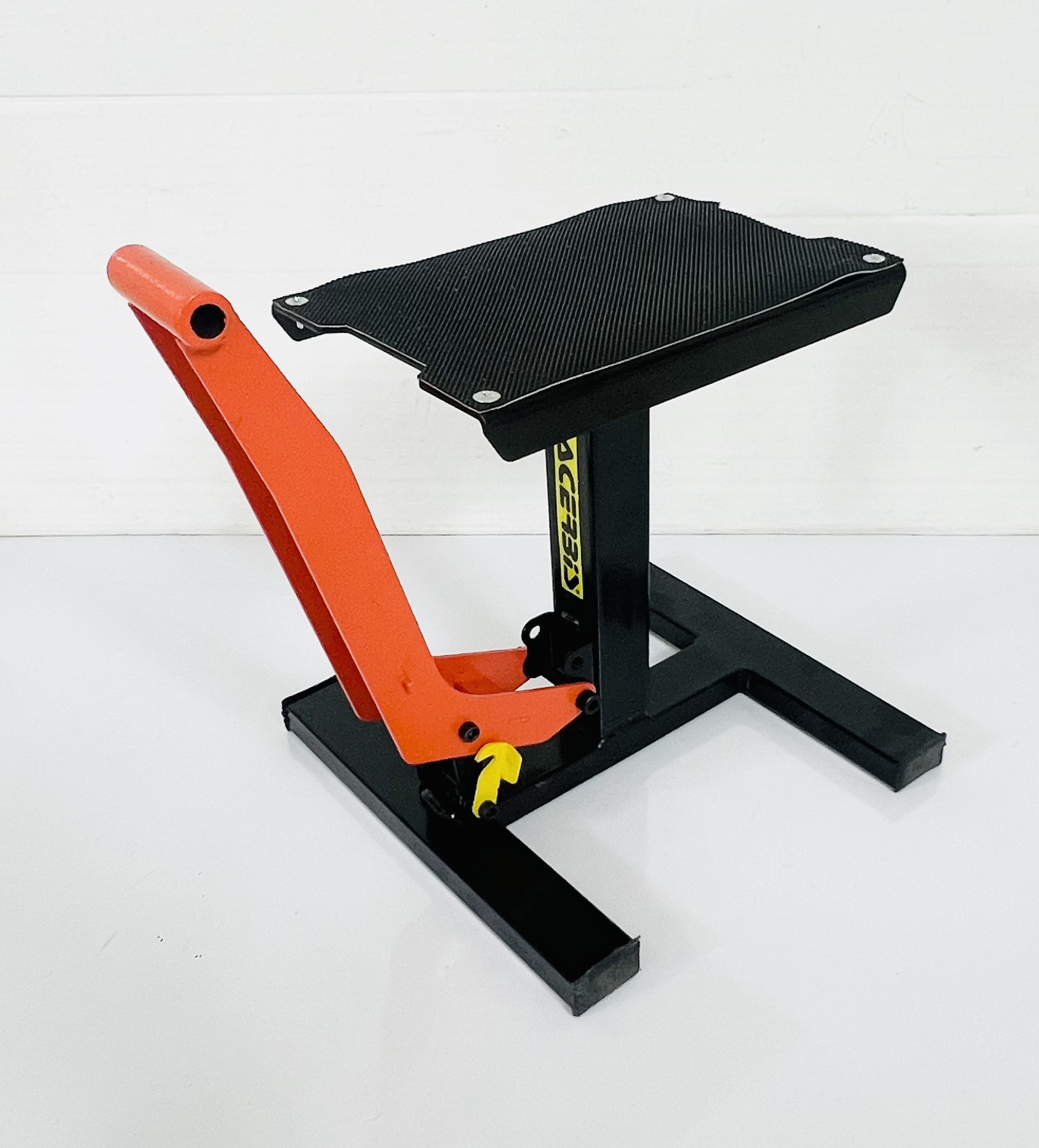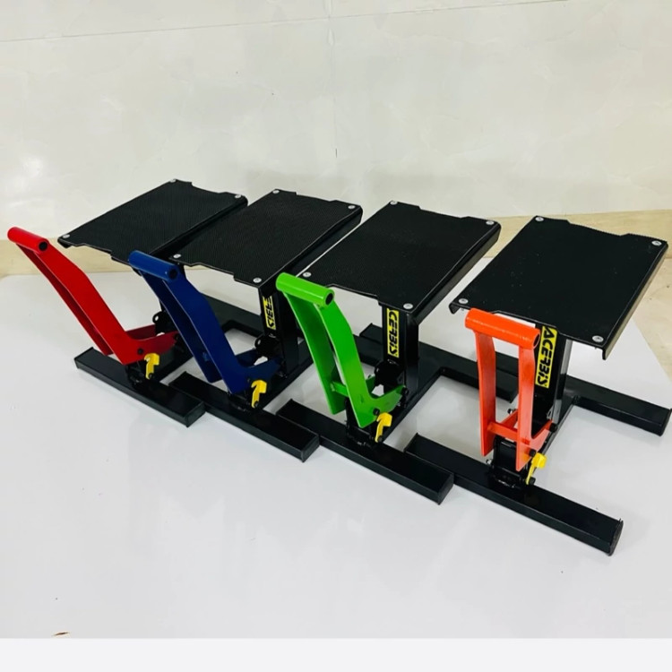 جک پدالی مخصوص انواع موتورهای کراس و تریل که فاقد جک وسط هستند طراحی و تولید شده است. در زیر شاسی موتور قرار گرفته و با اعمال کمترین نیرو با مکانیزم اهرم بصورت پدال پایی، موتور تا وزن 150 کیلوگرم را به راحتی از روی زمین بلند میکند. در این حالت هر دو چرخ موتور از زمین جدا شده و موتور بصورت معلق بر روی جک قرار میگیرد که میتوان موتور را به مدت طولانی پارک کرد. عدم فشار به لاستیکها، عدم فشار به سیستم کمک فنر موتور، عدم فشار به کاسه نمدهای انجین و جلوگیری از نشت روغن از مزایای پارک موتور با این جک میباشد. همچنین بعنوان استند برای تعویض لاستیک، تعویض روغن و تعمیرات نیز استفاده میشود. با توجه به وجود پیچ ریگلاژ، میتوان ارتفاع جک را از27 سانتیمتر تا 35 سانتیمتر تنظیم نمود که برای انواع موتورهای کراس و تریل با ارتفاعهای مختلف قابل استفاده خواهد بود. دارای قفل پیچ ریگلاژ میباشد که بعد از تنظیم ارتفاع جک به اندازه دلخواه بکمک آن میتوان پیچ ریگلاژ را قفل کرد. همچنین در حالتی که موتور روی جک قرار دارد میتوان بطور کامل موتور را چرخاند. دارای ضامن قفل پدال برای جلوگیری از آزاد شدن پدال نیز میباشد.